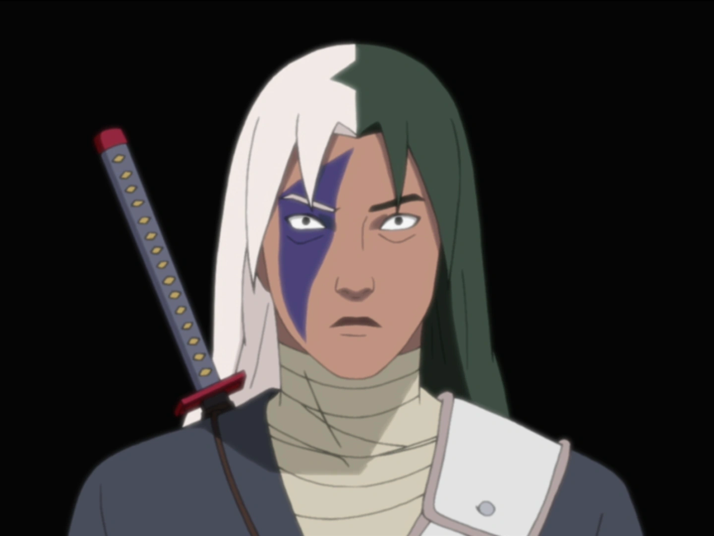 Blue B had long bi-color hair (half green half white) with matching eyebrows along with heavy-lidded eyes that give him the appearance of being very tired. He had a purple mark in the shape of a diamond down the right side of his face. He wore the standard attire of the Kumogakure shinobi including a flak jacket, over a long-sleeved V-neck outfit with bandages underneath and carried a fairly long sword strapped to his back. After being reincarnated, he looked like he did while alive with the exception of pupil-less eyes and grey sclerae.[2]