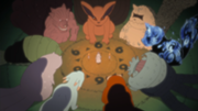 - (To the tailed beasts) “I don’t have long any more. Shukaku, Matatabi, Isobu, Son Gokū, Kokuō, Saiken, Chōmei, Gyūki, Kurama. Even though you have been separated, you shall always be together. Until eventually that time shall come when you will become one… You each carry a name… And with a different shape than you had up to now, you will be shown a righteous path, different from the time you spent inside of me. What is true power… …Until that time… (「私はもう長くない 守鶴・又旅・磯撫・孫悟空・穆王・犀犬・重明・牛鬼・九喇嘛 離れていてもお前達はいつも一緒だ いずれ一つとなる時が来よう…それぞれの名を持ち…今までとは違う形でな そして私の中に居た時と違い正しく導かれる 本当の力とは何か… …その時まで…」, “Watashi wa mō nagakunai. Shukaku, Matatabi, Isobu, Son Gokū, Kokuō, Saiken, Chōmei, Gyūki, Kurama. Hanarete ite mo omaetachi wa itsumo issho da. Izure hitotsu to naru toki ga koyō… Sorezore no na o mochi… Ima made to wa chigau katachi de na. Soshite watashi no naka ni ita toki to chigai tadashiku michibikareru. Hontō no chikara to wa nani ka… …Sono toki made…”)”[36]