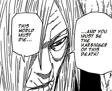 - (To a White Zetsu clone) "Oh, is that a fact? Then why were you surprised when Hyūga activated Sage Mode? I'll tell you why, because your 'recordings' doesn't cover the battles we had during the Second War! Your bonehead creator picked a fine chapter to omit from your records. That's right, my friend — does a clone, like yourself, ever experience fear?!"