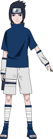 Sasuke’s typical clothing has changed a number of times throughout his life, but the Uchiha clan’s crest is usually present somewhere on his clothing, such as the back of his shirt collar. For most of Part I, he wears a navy blue, short-sleeved shirt with a high collar, white shorts, and, for a time, white arm warmers. During the Chūnin Exams’ finals, he wears a black, one-piece version of this usual attire with many small belts adorning his left arm and similar bands around both legs. He wears a blue-clothed forehead protector with both of these outfits but starts wearing it less and less after being hospitalized by Itachi, finally abandoning it entirely at the end of Part I.