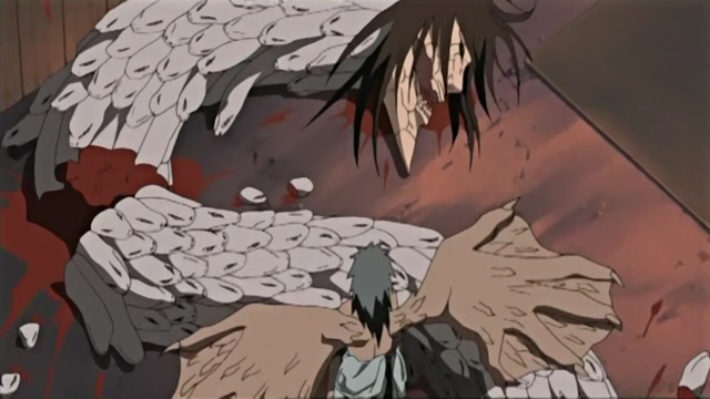 - (To Naruto) “Just shut up for once! What the hell do you know about it?! It’s not like you ever had a family in the first place! You were on your own right from the beginning, what makes you think you know anything about it?! Huh?! I’m suffering now because I had those ties, how on earth could you possibly understand, what it feels like to lose all that!”[57]