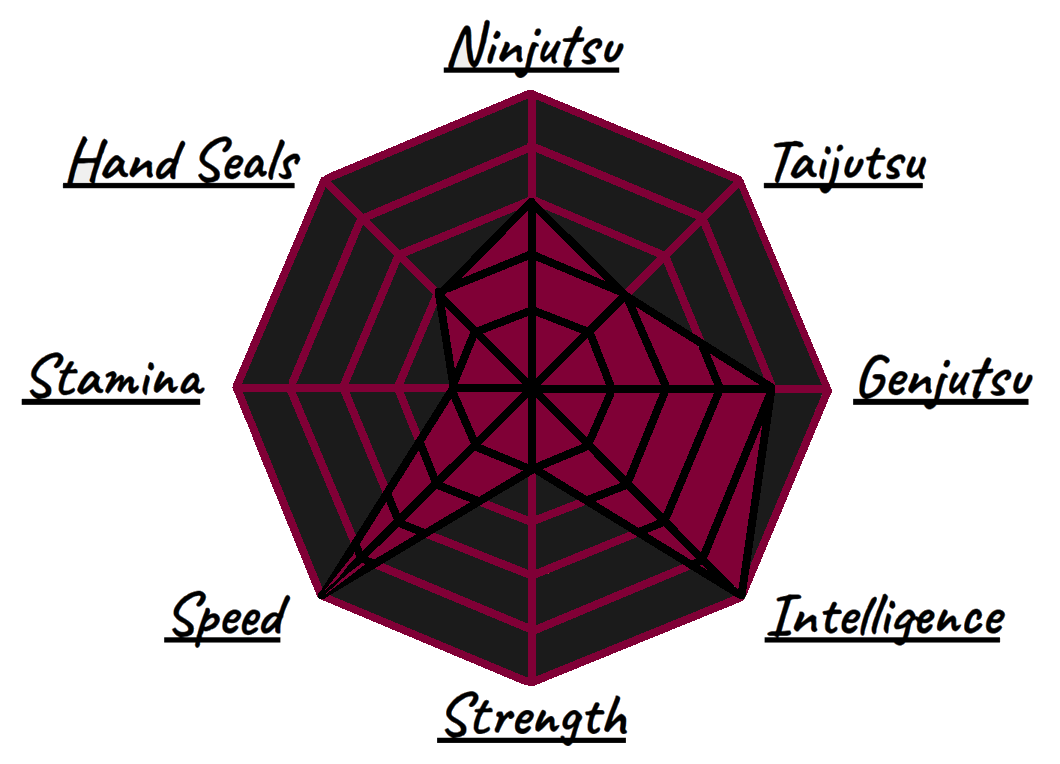 Born with a naturally weak constitution, Shichi was very prone to sickness during her youth, often missing academy class or needing to turn down mission opportunities as a result of her ill health. Considering her body's poor durability, she's quite fragile, and thus, very susceptible to hard-hitting attack styles such as Strong Fist taijutsu. Unable to take a hit and lacking in physical strength, it's essential that Shichi relies on her superior speed and dexterity.