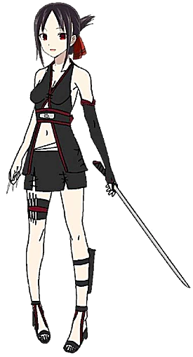 Moving downwards, Shichi sports a short, but flexible skirt that reveals her legs; a few support bandages can be seen wrapping around the left side of her waist. On her upper right thigh, Shichi has a strap equipped with senbon and on her lower left leg, she wears a utility pouch which also sheathes a small Tantō. She often wears revealing, slightly heeled sandals on her feet although it's not too uncommon to see her in simple "flip-flop" sandals. On her left arm, Shichi wears a long finger-less glove that extends past the elbow; her being left-handed, this is the same hand she wields her sword with.