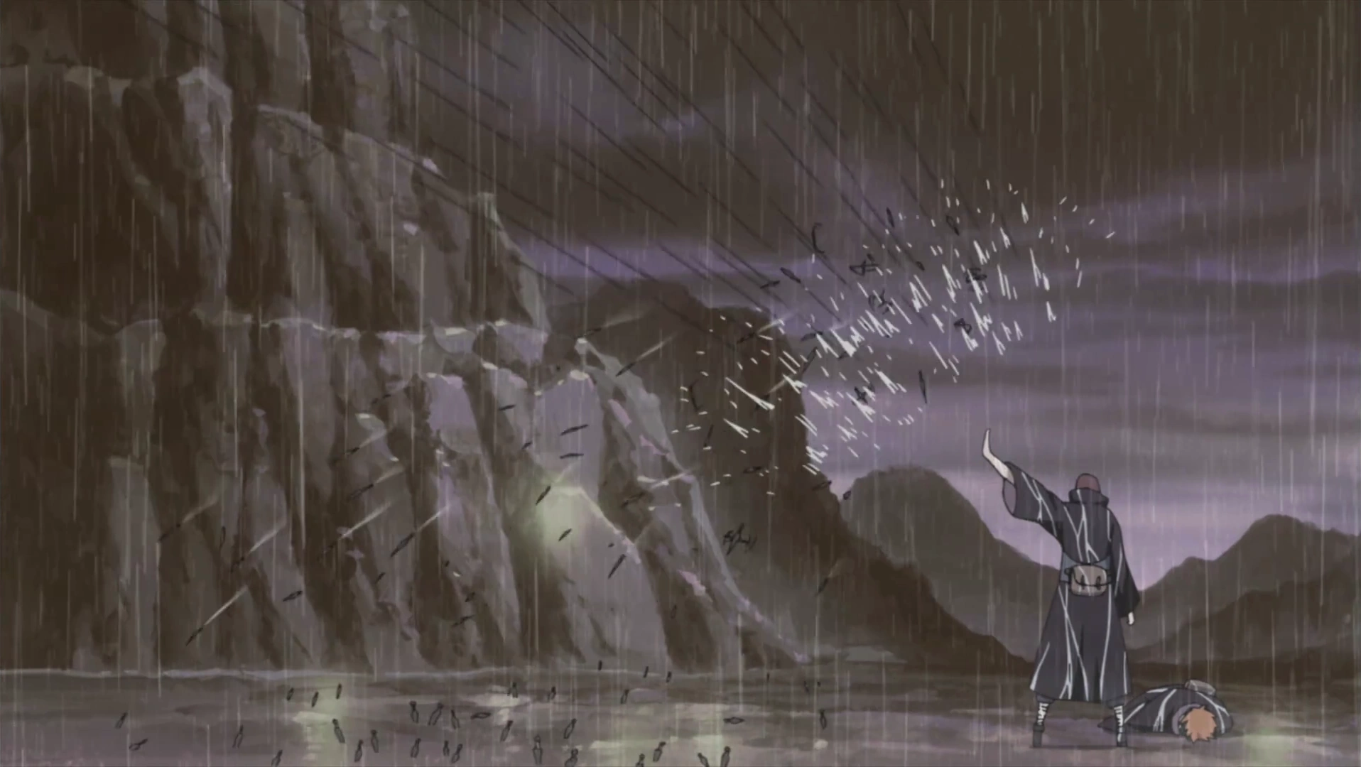 In Amegakure, Yahiko, Nagato, Konan, and many other shinobi formed a group that eventually fought the rule of Hanzō who as approached by Danzō Shimura who manipulated the paranoid leader into believing Akatsuki would attempt to usurp his power. He offered to help Hanzō in eliminating this supposed threat to his leadership with his Root Anbu in exchange for an alliance with Konoha against Iwagakure, a mutual enemy. Agreeing to the new alliance, Danzō had his undercover operatives capture Konan while on patrol before Yahiko and Nagato arrived at the planned meeting place. There, Konan was brought as a prisoner by Root Anbu while Yahiko and Nagato were surrounded by Hanzō, Danzō, and their combined forces from a higher vantage point. Hanzō demanded Nagato kill Yahiko in exchange for Konan’s life. Nagato could not bring himself to kill Yahiko, and Konan was about to be killed under Danzō’s orders when Yahiko committed suicide by impaling himself on Nagato’s kunai and slumping onto Nagato whose emotional trauma awakened his Rinnegan powers, using Shinra Tensei to a shower of kunai from both Root and Ame shinobi. He then rescues Konan but at the cost of a paralyzing injury to his legs by Hanzō’s Fire Release: Exploding Flame Formation. Danzō left via the Body Flicker Technique alongside his Root Anbu, abandoning Hanzō and his forces. Angered by Danzō’s betrayal, Hanzō orders his shinobi to attack them. Nagato summoned the Demonic Statue of the Outer Path and by using the black receivers which embedded itself into his back, it was able to slaughter every shinobi instructed to kill him. Not completely satisfied, Nagato attempted to kill Hanzō who fled via the Body Flicker Technique. With Yahiko and the other remaining members of Akatsuki dead (killed by the masked man and Zetsu, unbeknownst to everyone), Nagato and Konan were the only survivors left. Nagato was later confined to a machine for the rest of his life, his body having become severely emaciated as a result of his linking with the statue. He later became the new leader of the new Akatsuki while slashing his forehead protector, revealing he no longer wanted to be associated with Hanzō. Eventually, a civil war erupted, splitting Amegakure until it ended when Nagato’s Six Paths of Pain eliminated the members of Hanzō’s faction while Nagato, using Yahiko’s body, confronted and later killed Hanzō.